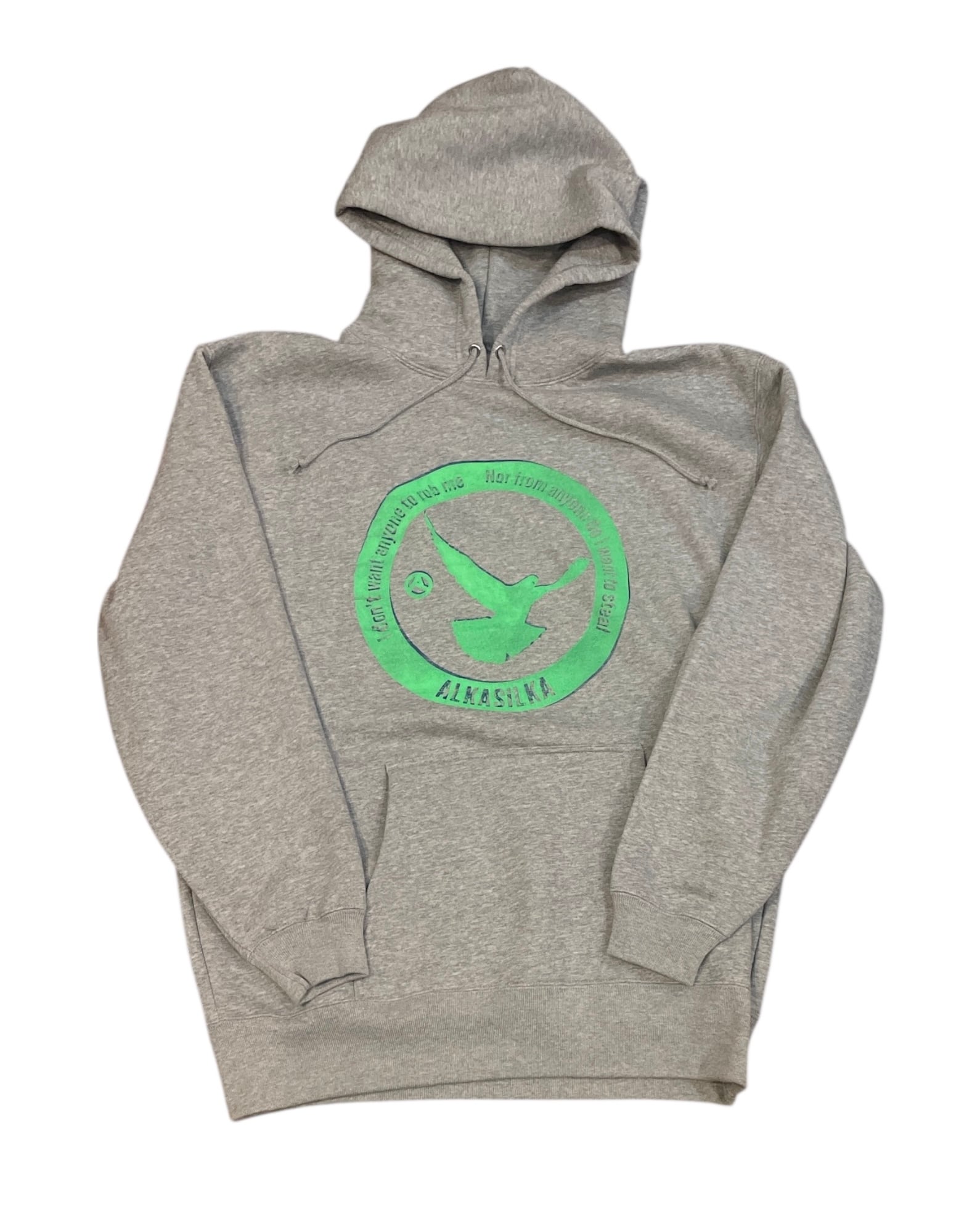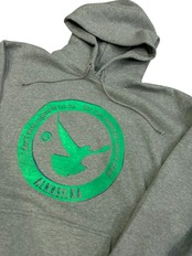 鳩フーディ(裏起毛)グレーに青インクと蛍光グリーンインクを使用。
