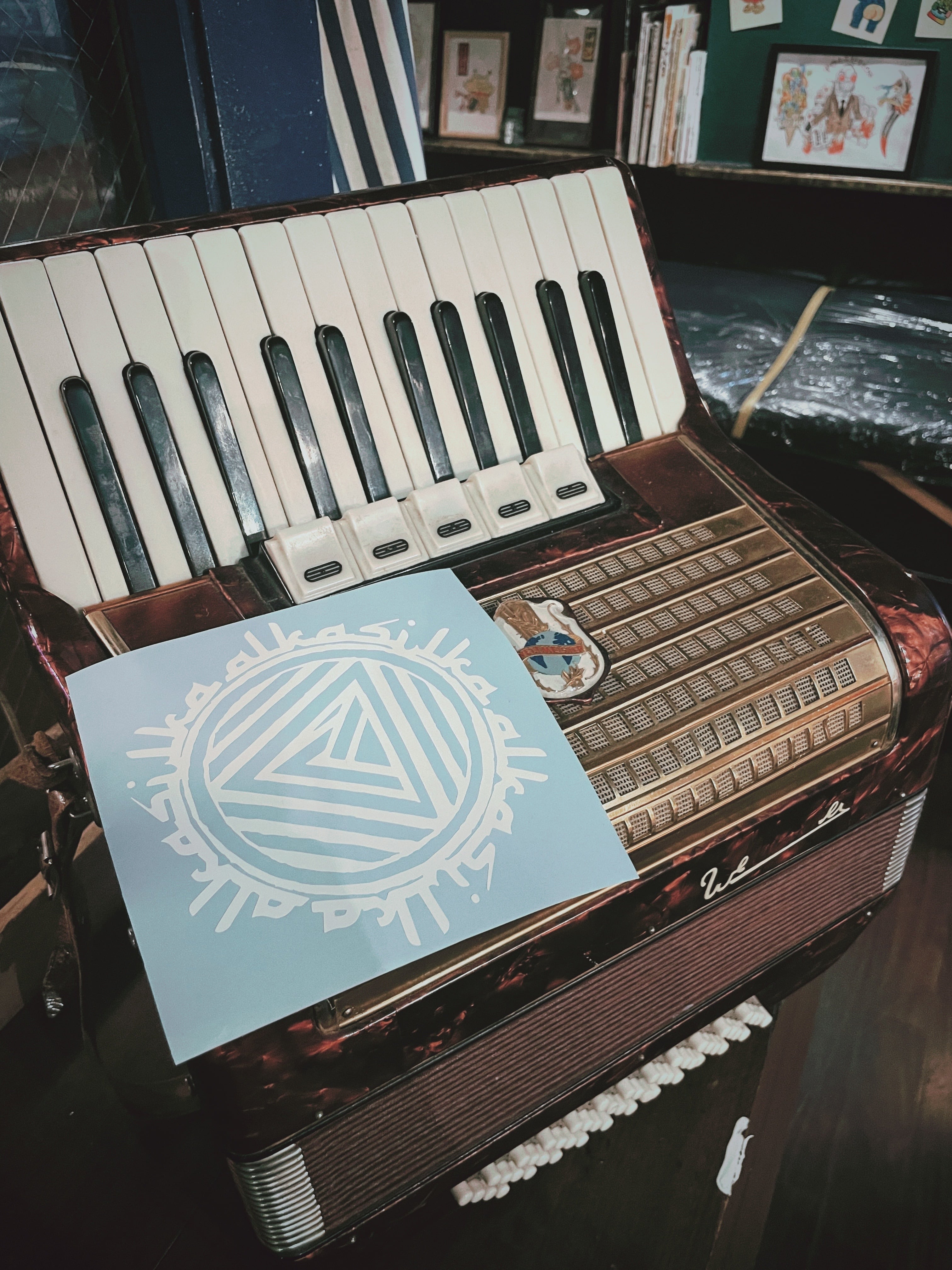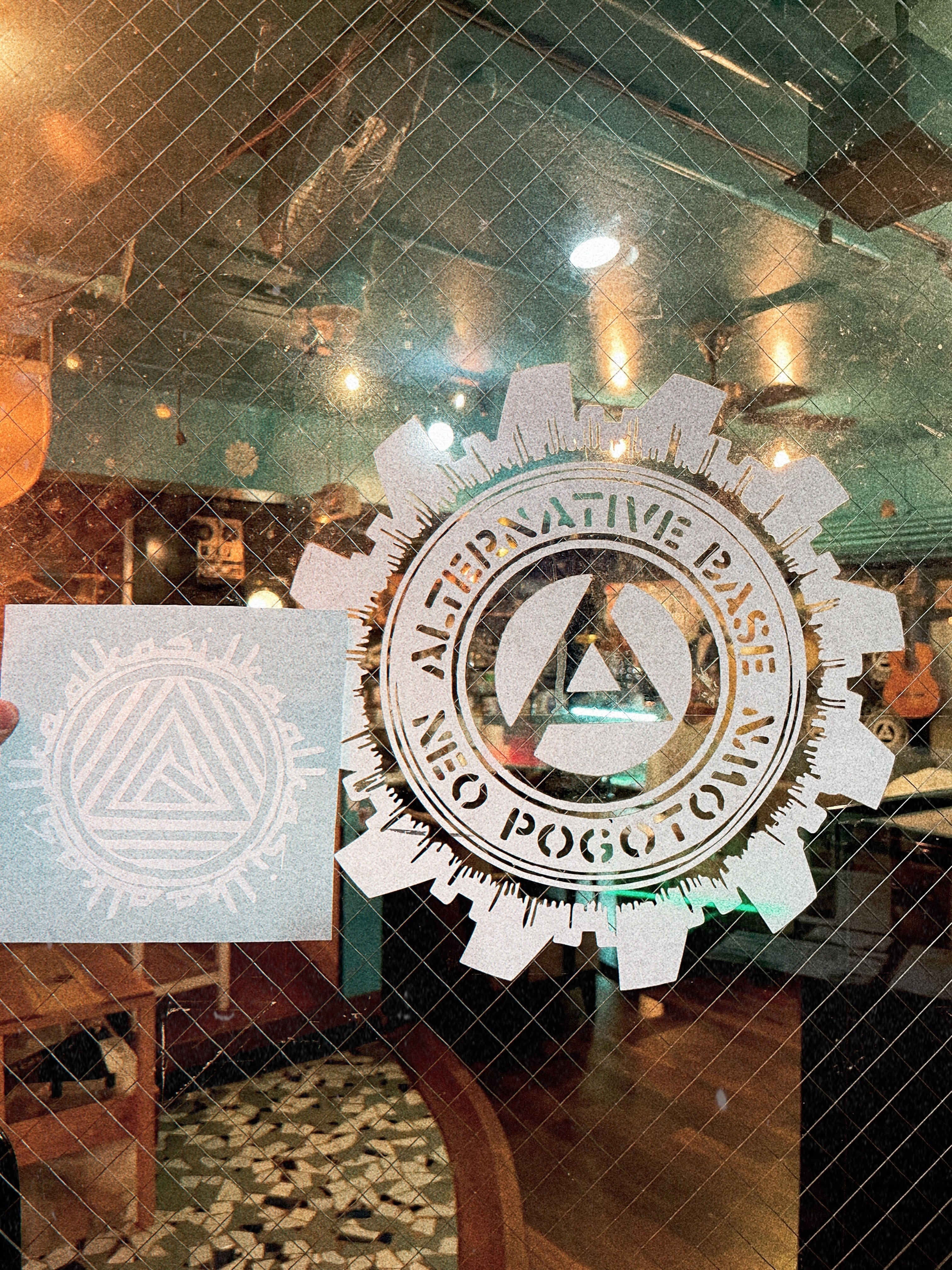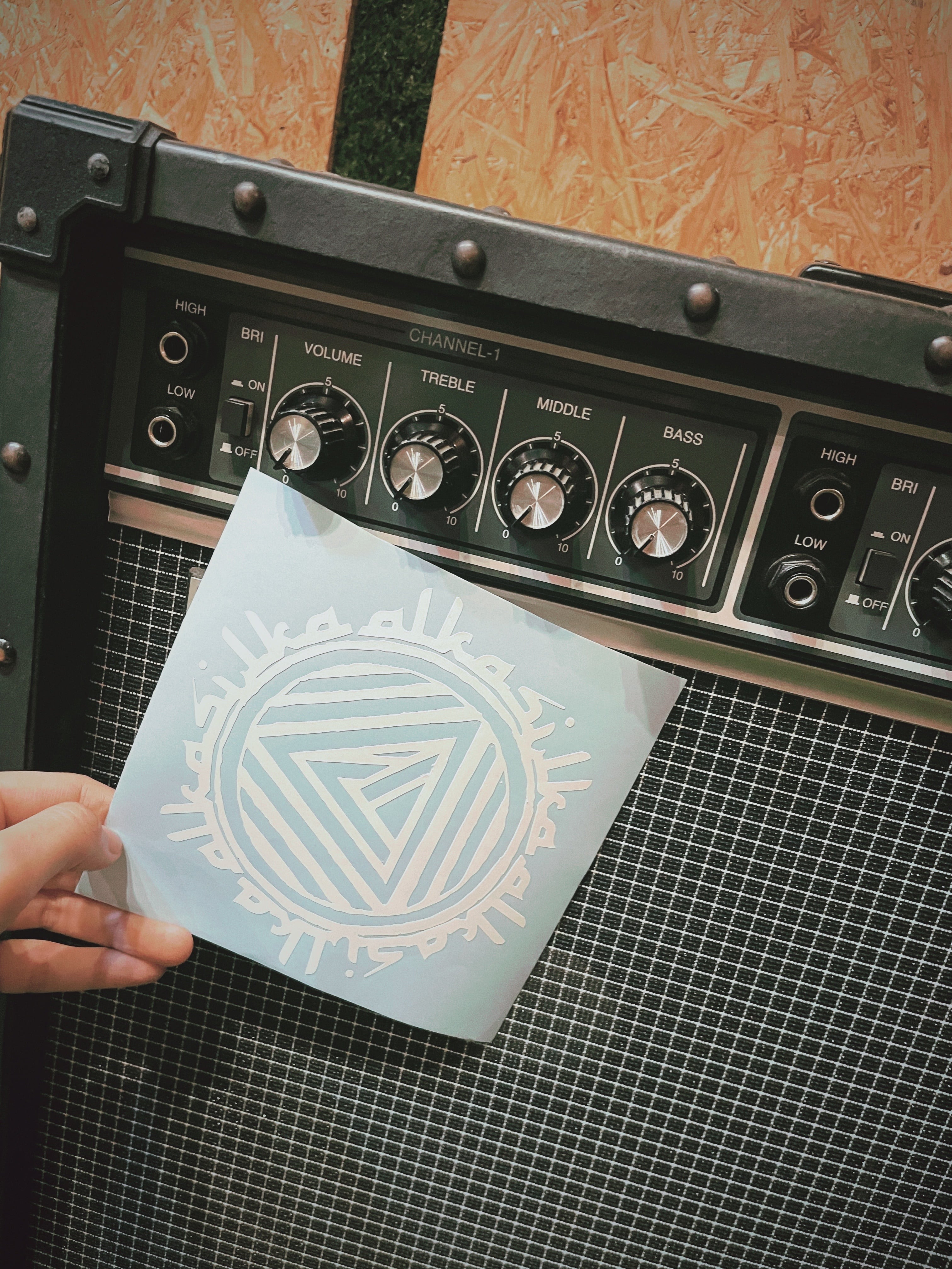 雨や日光にも強い白色のビニールステッカーです。サイズはおおよそ横15cm x 縦14cmです。